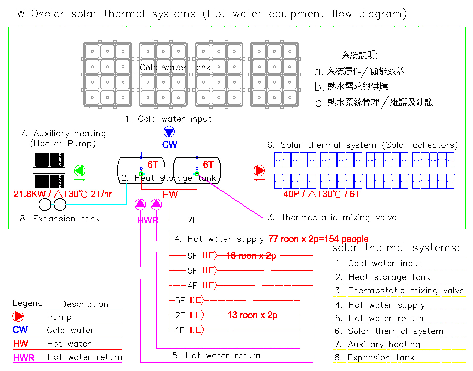 - 長期壽命、高運轉效率、高投資報酬率的整體完善的太陽熱能(熱泵)熱水供應系統。