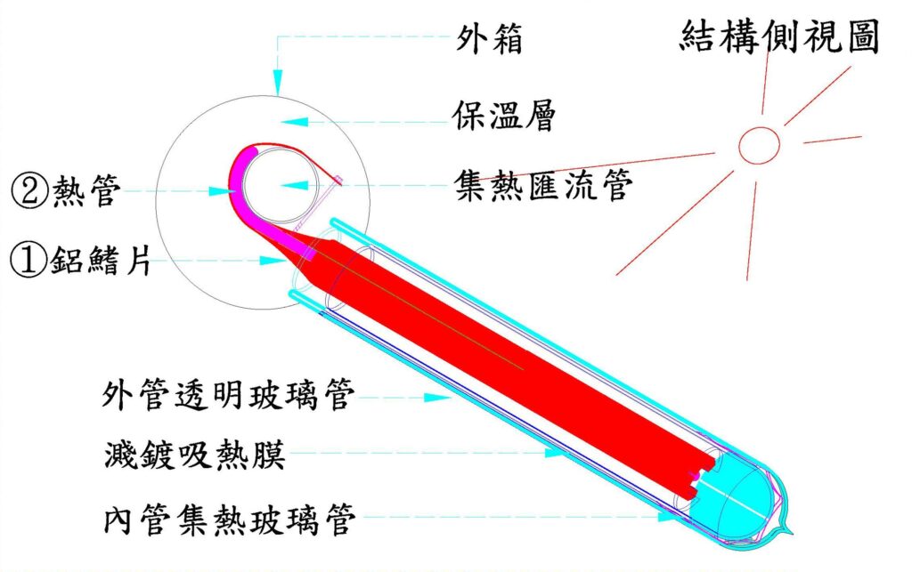 陽光下持續自我運轉免費釋熱的–熱管真空管太陽能集熱器,以真空玻璃內管上的藍色濺鍍塗層透過真空斷熱層吸收太陽輻射熱能,熱傳於管內鋁鰭片再將熱能熱傳給熱管;熱管內部主要以工作液體的汽、液相變傳熱,熱阻很小,因此具有很高的導熱能力並熱交換加熱於匯流管內水液。
