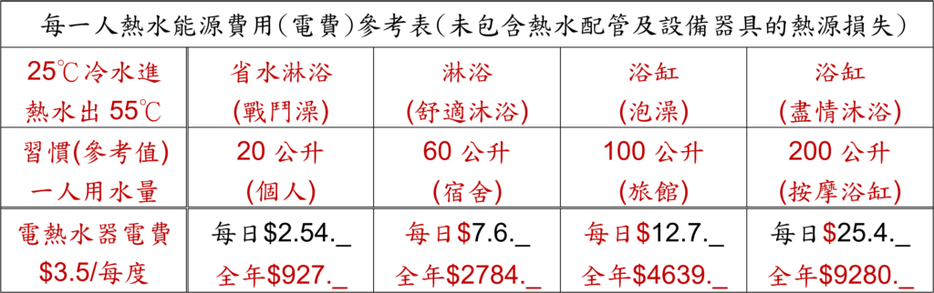 發佈於 30 6 月, 202230 6 月, 2022 作者: FOREST LAI熱水供應 工業/商業/住宅~熱水供應居家/各行/各業熱水溫度需求:住宅、宿舍、民宿、餐旅業、美容業、醫療養院、工業製程、溫水游泳池等。 洗澡熱水每人使用需求量及費用 (參考值) 各式熱水器能源費用分析比較表